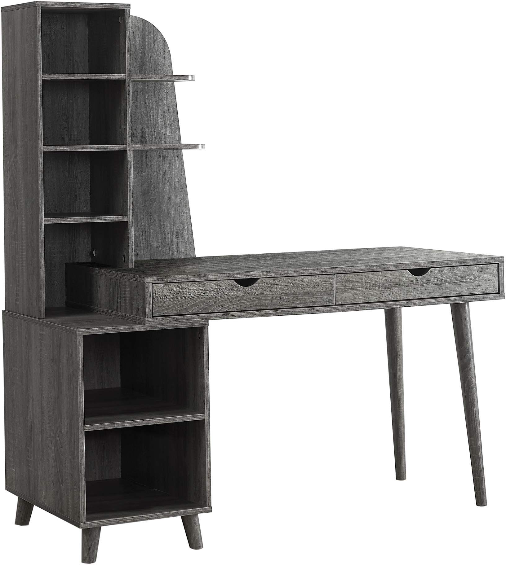 Voici une solution tout-en-un élégante et pratique pour construire votre bureau à domicile ou votre centre d'études! Ce bureau d'ordinateur moderne d'inspiration rétro avec une bibliothèque attachée sur le côté (non réversible), dispose de plusieurs options de rangement pour vos besoins de travail quotidiens. La surface de bureau rectangulaire lisse et spacieuse offre beaucoup d'espace pour votre ordinateur portable, une lampe et des fournitures de bureau ainsi que 2 grands tiroirs de rangement pour ranger le matériel d'écriture. Les 7 étagères fixes sont disponibles dans une variété de tailles comme unité de rangement facilement accessible. L'ensemble du poste de travail est soutenu par des pieds angulaires et fini dans un gris riche. L'assemblage est requis.