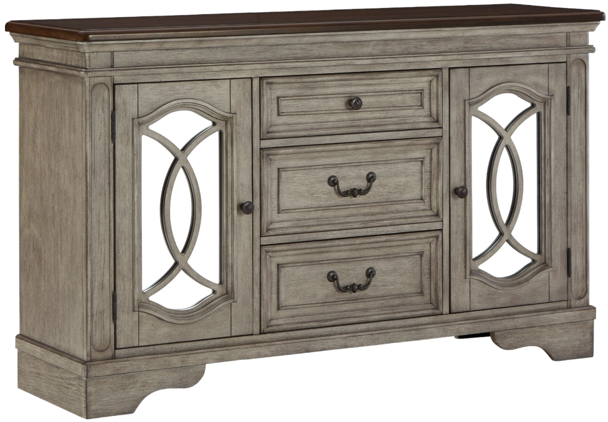 Ajoutez une touche de style cottage traditionnel avec cette desserte de salle à manger. Elle comporte une paire de portes d'armoire avec verre miroir incrusté et chantournage décoratif. Les trois tiroirs coulissants, avec une construction en queue d'aronde et des fonds en feutre noir, sont parfaits pour ranger des articles plus délicats. Un corps gris antique et un riche plateau brun noyer foncé, ainsi que des poignées et des boutons en bronze foncé, complètent le magnifique design.Read More