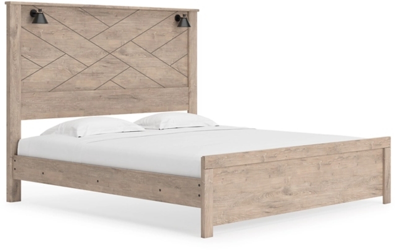 Frais, net et moderne. La finition naturelle claire de ce grand lit à panneaux donne le ton à votre sanctuaire apaisant. Des appliques noires mates et un motif abstrait sur la tête de lit apportent un regard neuf au profil tout simplement superbe du lit.Read More